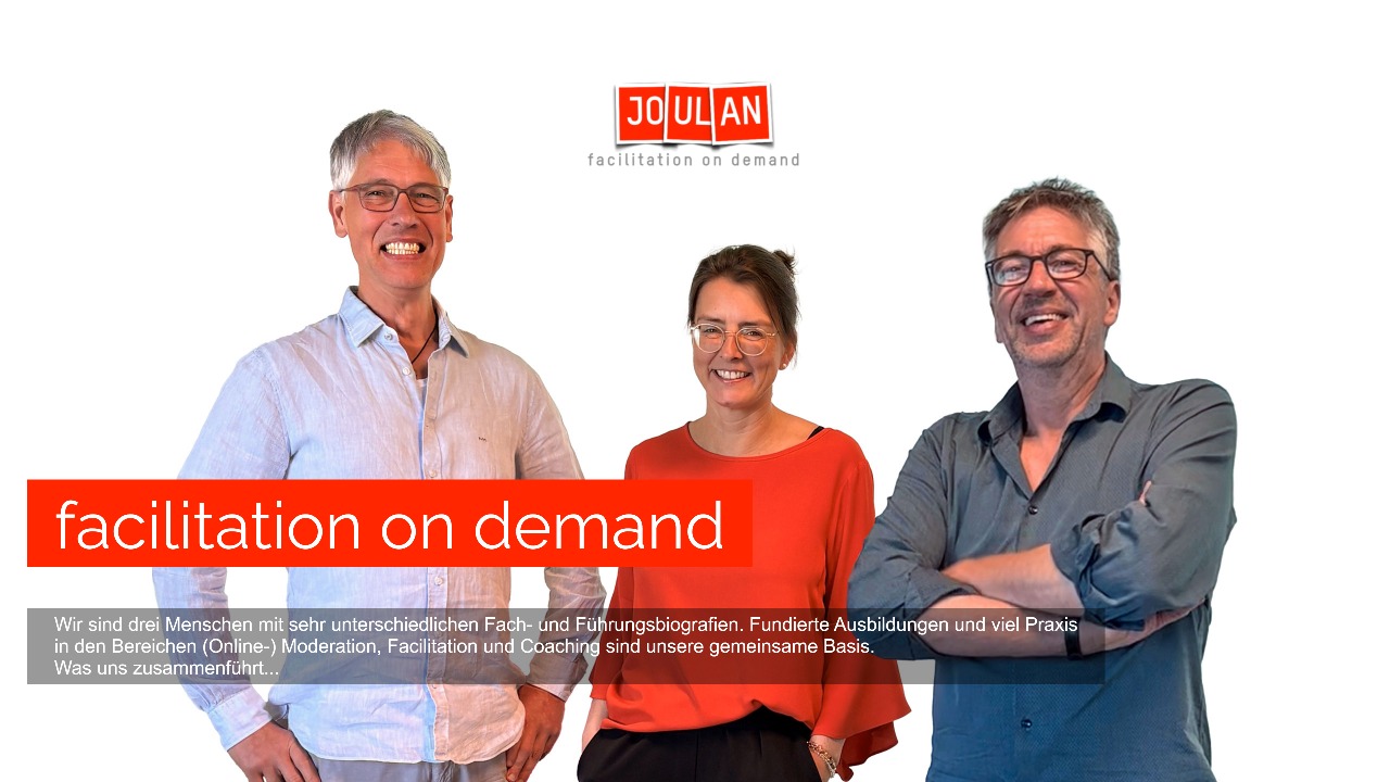 Wir sind drei Menschen mit sehr unterschiedlichen Fach- und Führungsbiografien. Fundierte Ausbildungen und viel Praxis in den Bereichen (Online-) Moderation, Facilitation und Coaching sind unsere gemeinsame Basis. Was uns zusammenführt ist die Leidenschaft für wirksame Prozessbegleitung, der Spaß am kreativen Lernen, wertschätzender Kommunikation und Zusammenarbeit, die auf Augenhöhe stattfindet.